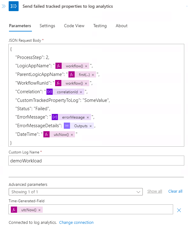 - Log the error (Log Analytics custom table). I do custom logging on each workflow for traceability purposes to a custom Log Analytics table specifically for the integration we’re building. This way we can easily track all “searchable” (tracked) properties and the status of each workflow (receive, process, send). This action does the regular “tracked properties” based on the input Json combined with custom logging.